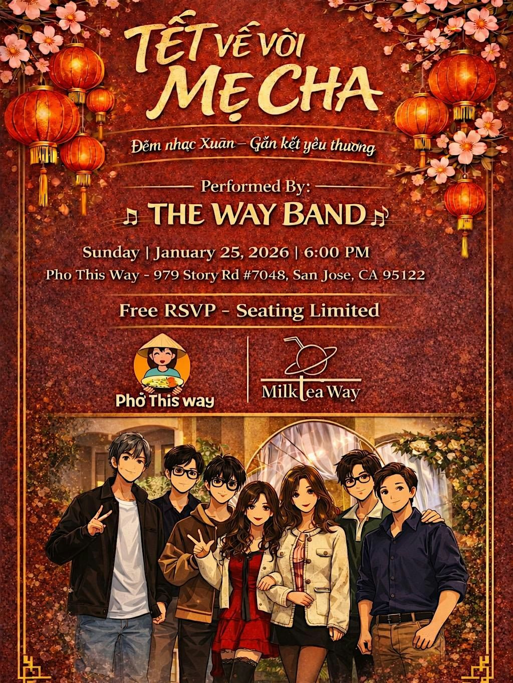 The evening will be performed by THE WAY BAND, featuring gentle, emotional Vietnamese songs—perfect for listening, chatting, and enjoying a cozy Tết atmosphere.