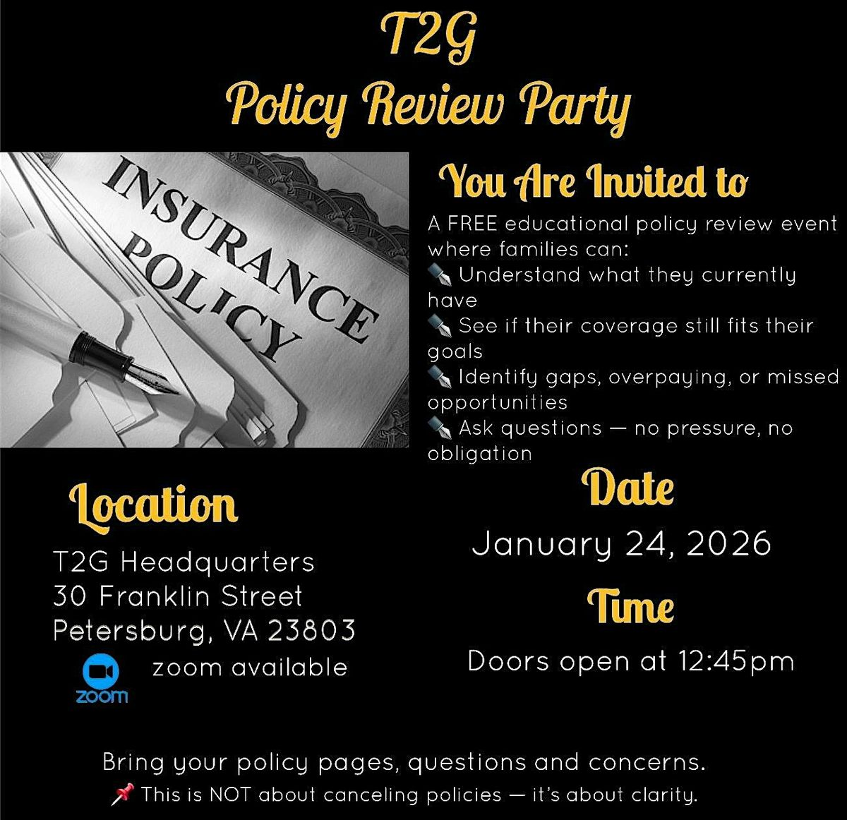 You are invited to the T2G Policy Review Party, a FREE educational event created to help individuals and families gain clarity around their existing life insurance policies — regardless of the company you’re currently with.
