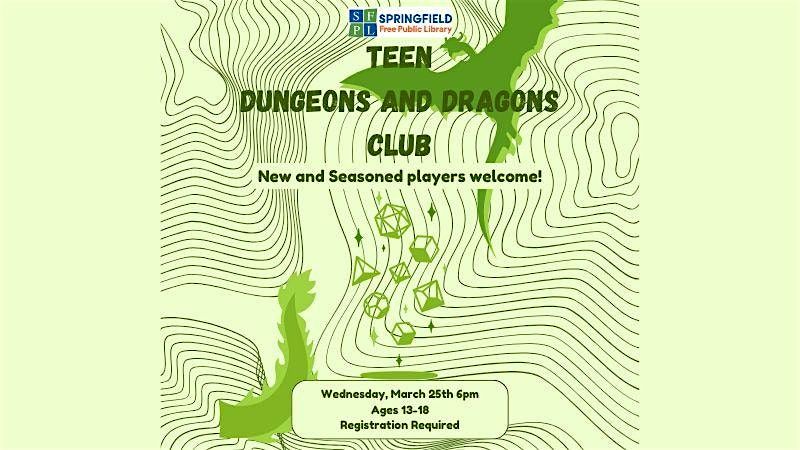 Dungeons and Dragons. Ages 13-18. New and seasoned players welcomed come with a level 2 character or use a premade one!