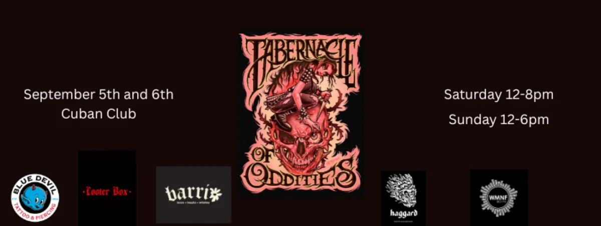 Tabernacle of Oddities is a two-day event at the Cuban Club in Ybor City, September 5th and 6th.All four floors are open and filled with over 100 purveyors, along with tattooers and artists working throughout the building. You’ll find a mix of oddities, antiques, art, books, and bones.There’s live entertainment happening across the space all weekend, plus a full schedule of performances and talks in the theater.Food will be outside with Vegan Gator and Barrios set up both days.