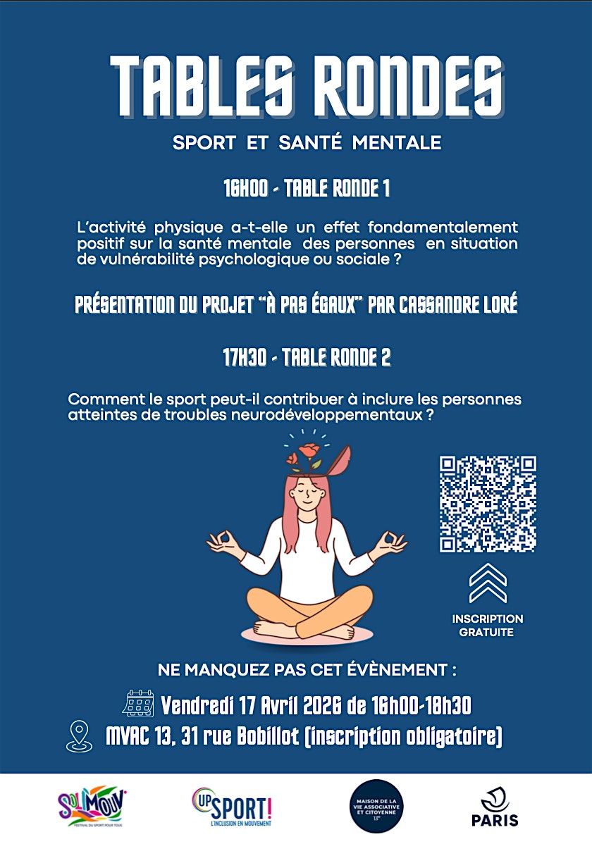 Les deux premières tables rondes se tiendront le vendredi 17 avril à la MVAC du 13ème et porteront sur les thématiques du sport au service de la santé mentale et des personnes en situation de handicap mental.