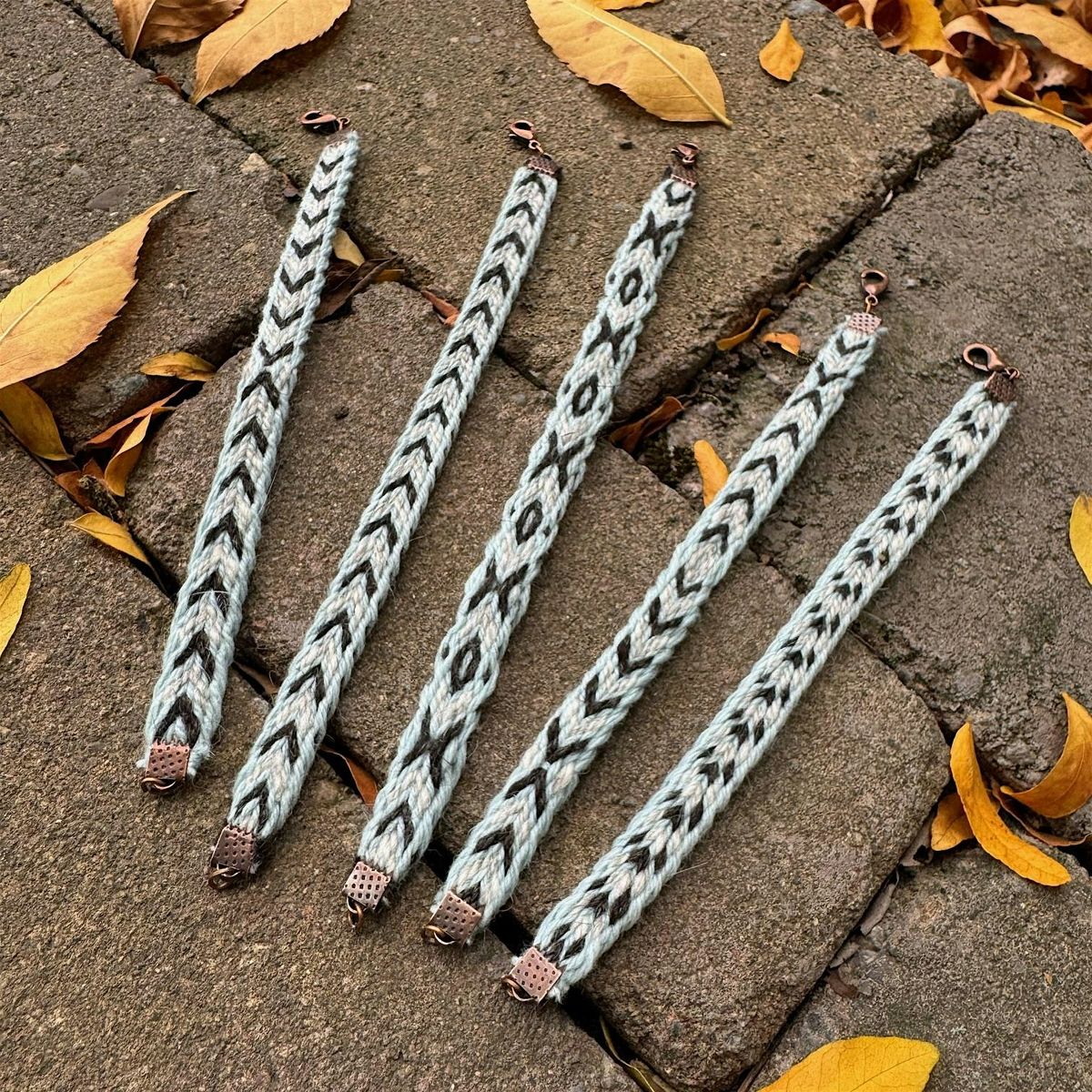 Participants will begin by learning how to warp their tablet weaving patterns and practice weaving a short band. Once they understand the basics and have worked out the muscle memory of weaving, they will weave a bracelet-length of band in their chosen pattern. At the end of the workshop, participants will complete their bracelets with copper findings. With these new skills, participants will be able to create woven bands for a variety of uses, including additional bracelets.