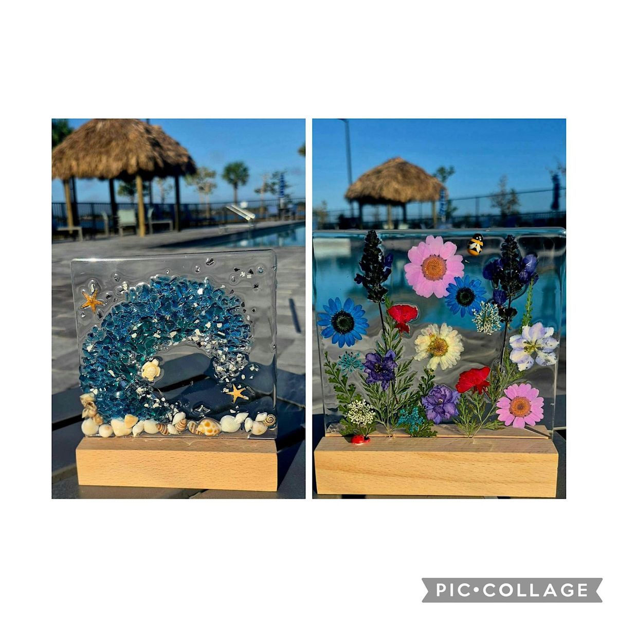 Join us for this beautiful tabletop light adorned with crushed glass and resin. You will create a beachy design with a wave and turtle -- shells and starfish too. Or you can choose the tabletop light with dried flowers and resin ----- Choose your design option at checkout. Pre-registration is required.