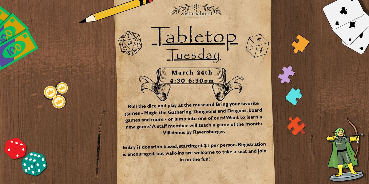 Join us at Wistariahurst Museum for a relaxed tabletop gaming event for players of all kinds! Bring your favorite games fro home or jump into one of the tabletop games that we will have available for guests to enjoy. Whether you’re into Magic: The Gathering, Dungeons & Dragons, classic board games, or something new, there’s a set for you at our tables. Bring your friends for a gaming session, or play, learn, and connect all at your own pace.