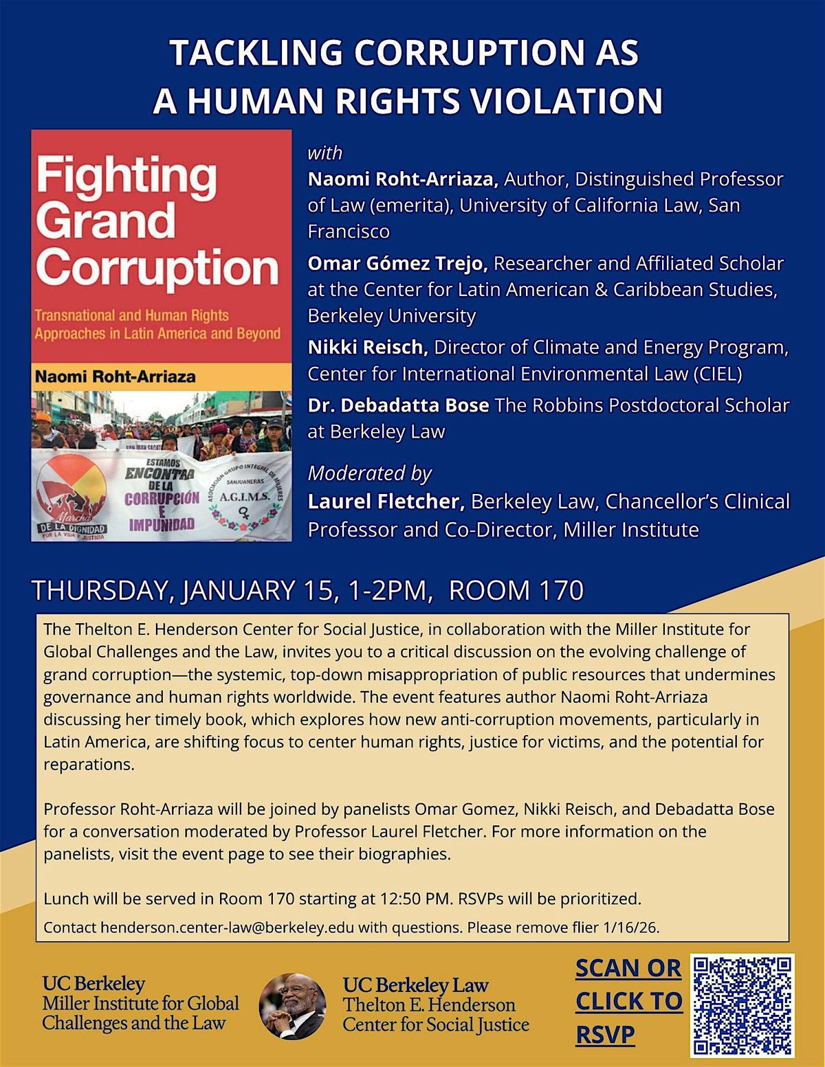 The Thelton E. Henderson Center for Social Justice, in collaboration with the Miller Institute for Global Challenges and the Law, invites you to a critical discussion on the evolving challenge of grand corruption—the systemic, top-down misappropriation of public resources that undermines governance and human rights worldwide. The event features author Naomi Roht-Arriaza discussing her timely book, which explores how new anti-corruption movements, particularly in Latin America, are shifting focus to center human rights, justice for victims, and the potential for reparations.