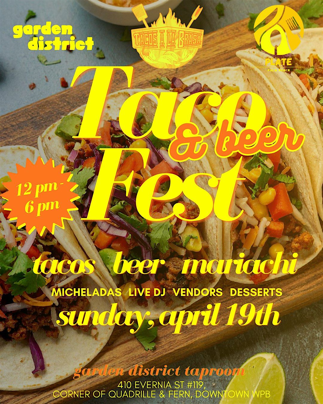 Join us Sunday, April 19th from 12-6 pm for a Taco & Beer fest at Garden District!