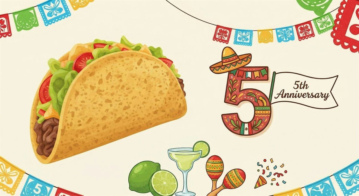 Join us in person for an awesome celebration of our 5th anniversary! We're serving up delicious tacos and plenty of good vibes. It's the perfect chance to hang out, meet new friends, and toast to five fantastic years together. Don't miss out on the fun – come hungry and ready to celebrate!