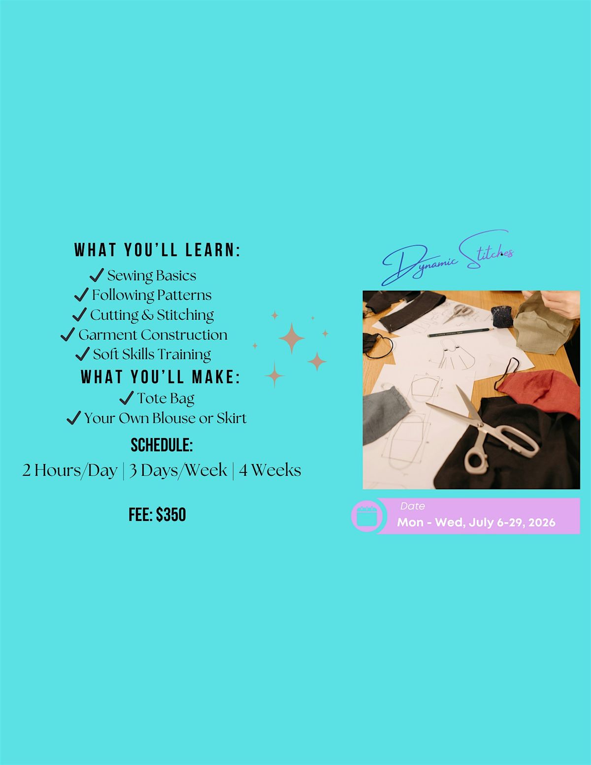 Ready to stitch your summer away? Join Dynamic Stitches Tailoring Summer Camp and dive into the world of fabrics, threads, and fun! Perfect for beginners and no experience needed, this in-person camp offers hands-on lessons where you’ll learn to create your own stylish pieces. Bring your creativity, meet fellow sewing enthusiasts, and make this summer unforgettable. Don’t just wear fashion—make it! See you at the camp! Limited Spots Available!!