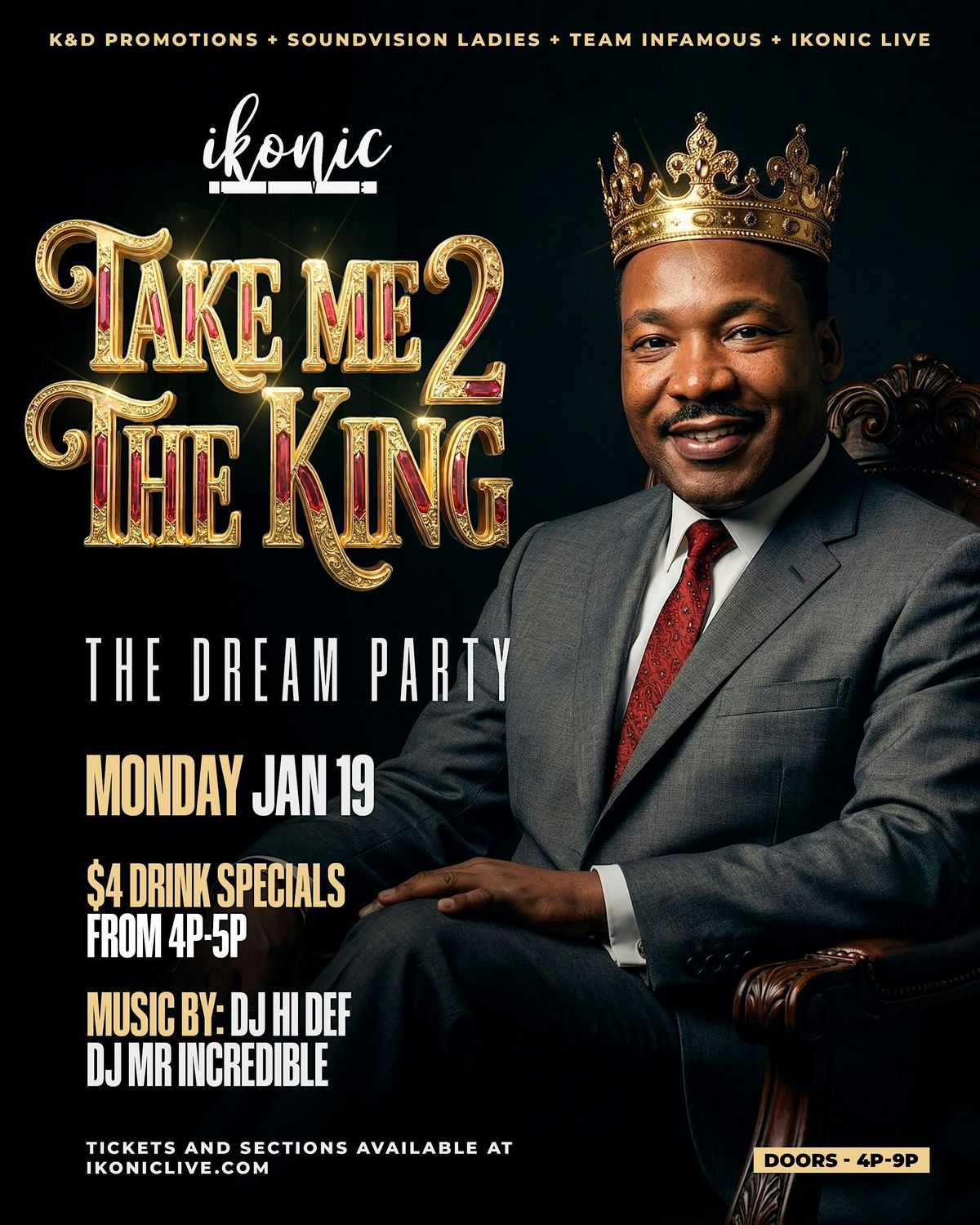 Welcome to the Take Me 2 The King Martin Luther King Day “The DreamParty” at Ikonic Live! Get ready for a day filled with music, dancing, and celebration. Join us on January 19, 2026 at 4:00 PM (Eastern Time) as we honor the legacy of Martin Luther King Jr. in style. Let's come together to commemorate his dream with the ultimate celebration . Music by Dj Mr Incredible & DJ Hi Def. Don't miss out on this unforgettable experience!