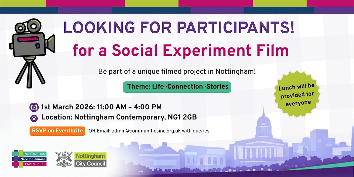 We’re inviting people from across Nottingham to take part in a friendly social experiment we’re filming soon, and we’d love you to be involved. We are looking for 150 such Nottingham based individulas.