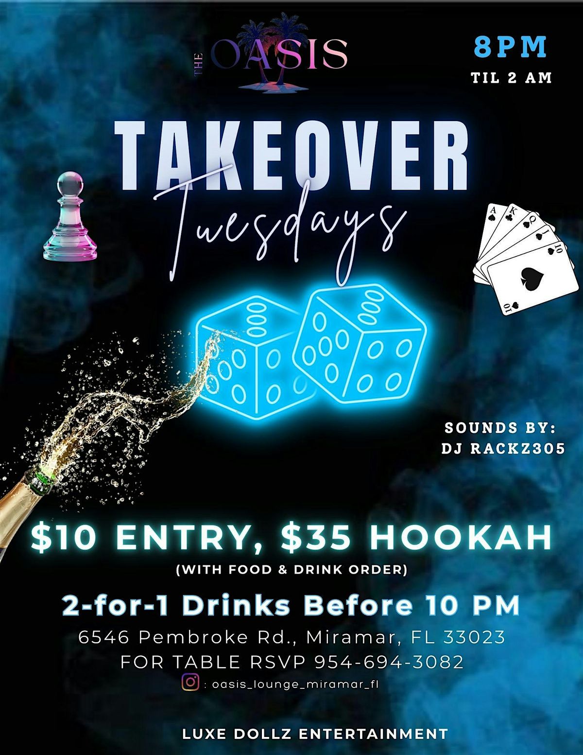 Every Tuesday night we’re turning Oasis Lounge into the mid-week vibe you didn’t know you needed. Pull up for good music, games, great energy, and the best Tuesday crowd in Miramar.