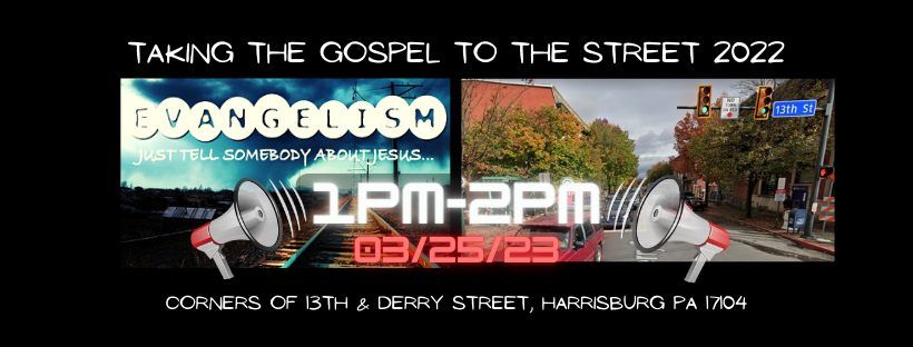 “The Great Commission isn’t quarantined; because God is not in quarantine! He’s everywhere, working in the hearts of people of every nation in every corner of the world. Jesus gave this great commission to a community who would work together and join God to help others know Jesus, follow him and make more disciples. We invite you to join us on the corners of 13th and Derry Street in Harrisburg as we once again, " Take the Gospel to the Street 2023! "