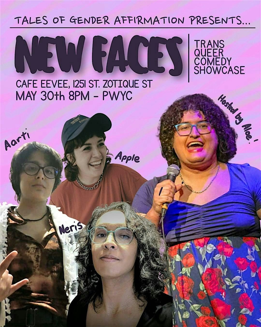 Tales of Gender Affirmation is just shy off our 5th anniversary of bringing joy through comedy and storytelling about trans, queer and ally lives right here in this city!!! We have a special new faces showcase to highlight all the new emerging talented artists in our community rising and shining!!! The showcase will take place at the cozy Café Eevee on 1251 St Zotique Est on Saturday May 30th at 8pm!!! Just pay what you can as a basket is passed around at the end of the show. Tickets are free to reserve in advance.