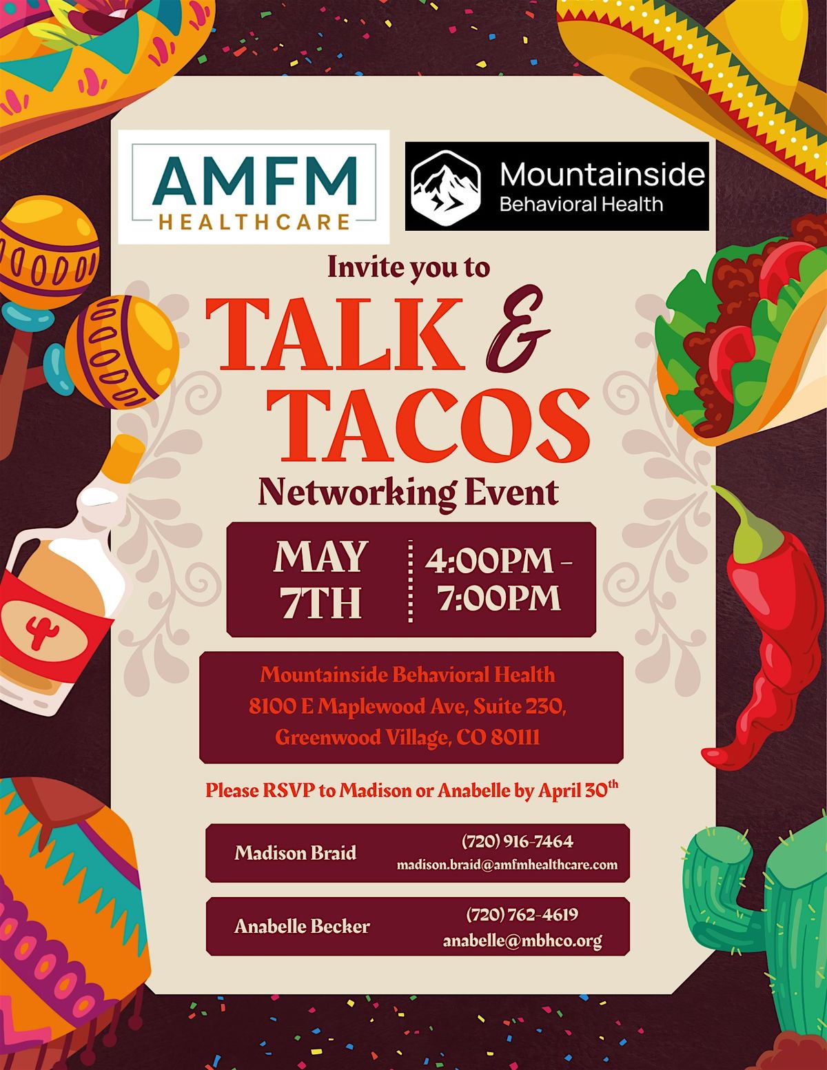 Bienvenido! Join us for a chill in-person event where you can enjoy some tasty tacos while chatting about mental health and resources. It's a great chance to connect, share stories, and learn more about the services at AMFM and Mountainside Behavioral Health. Bring your questions and your appetite!