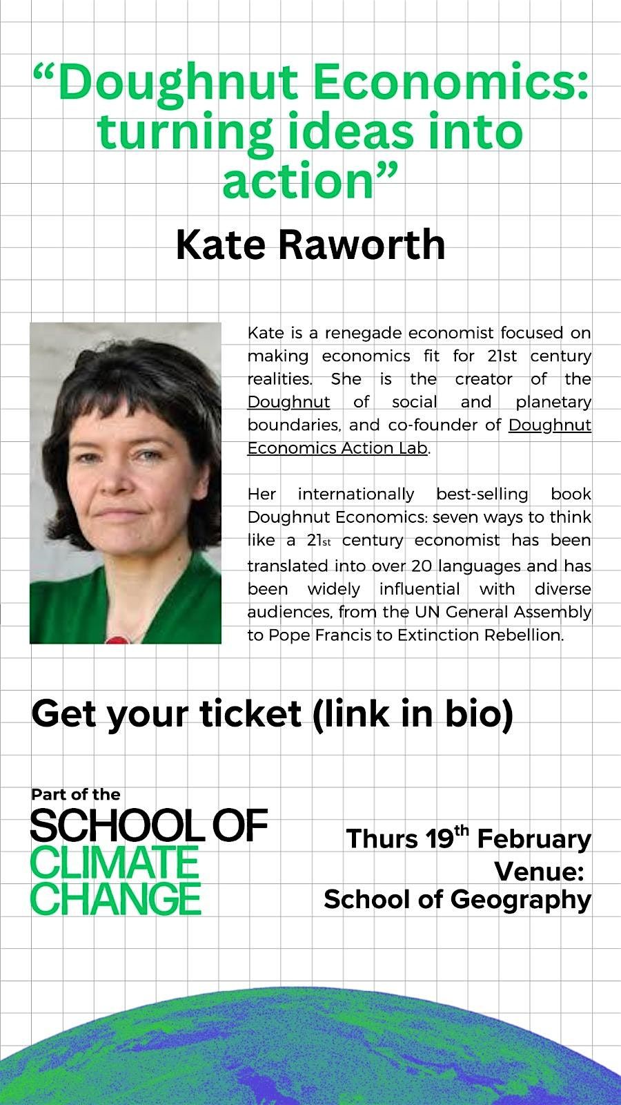 Her internationally best-selling book Doughnut Economics: seven ways to think like a 21st century economist has been translated into over 20 languages and has been widely influential with diverse audiences, from the UN General Assembly to Pope Francis to Extinction Rebellion.