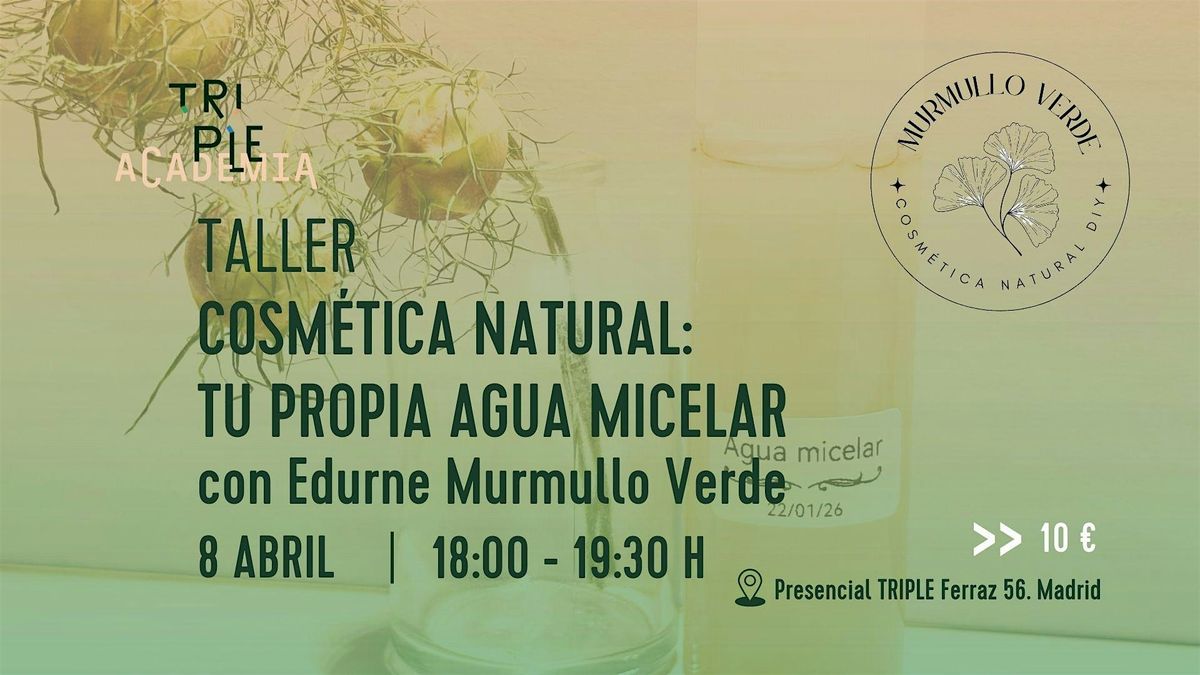 En este taller práctico Edurne Castillo de Murmullo Verde nos enseñará qué es un agua micelar y qué ingredientes la componen. Después elaboraremos dos productos adaptados a tu tipo de piel: un agua micelar y un desmaquillante bifásico que podrás llevarte a casa.