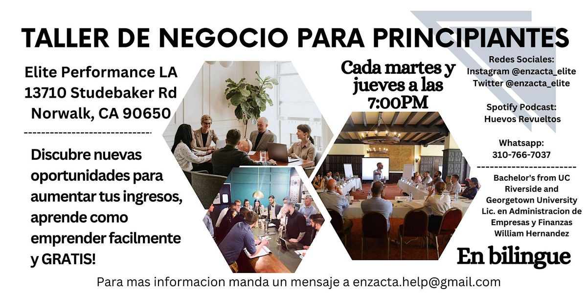 El negocio es un campo de trabajo que quizas puede intimidarte. El concepto de desarrollar un plan de trabajo requiere tiempo y compromiso. Con la direccion apropiada y el apoyo de un mentor vas aprender a como trabajar comodamente y con exito para sobresalir en el mundo del negocio. Me comprometo a trabajar contigo personalmente para ayudarte a crear estrategias con creatividad para que tengas alto rendimiento! Hablo ingles y espanol. Te invito a que te des la oportunidad de aprender a emprender! Los talleres son gratis TODOS los martes y jueves a las 7:00PM en la ciudad de Norwalk, CA. Para mas informacion manda un correo electronico a [email protected].
