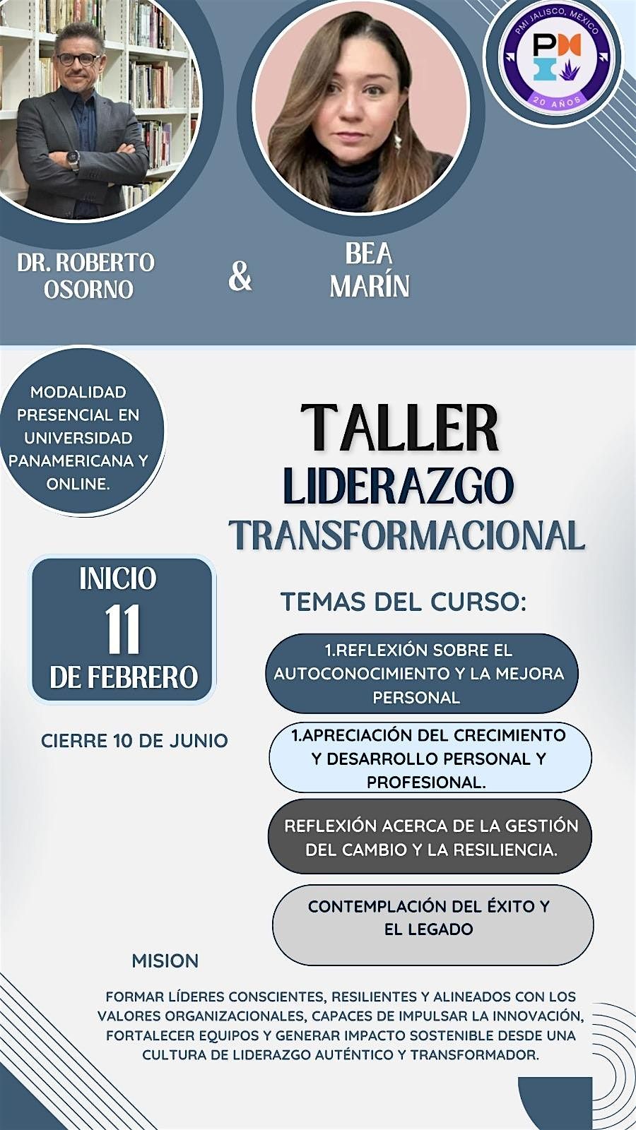 Sumérgete en una experiencia transformadora diseñada para líderes comprometidos con el crecimiento personal, la influencia positiva en sus equipos, y el éxito sostenible de sus proyectos y organizaciones. A través de 4 sesiones presenciales en la Universidad Panamericana y 4 sesiones en línea, este taller te permitirá desarrollar habilidades clave de liderazgo transformacional. Exploraremos dimensiones personales, emocionales y estratégicas para que puedas liderar con autenticidad, adaptarte al cambio y dejar un legado significativo en tu entorno profesional.