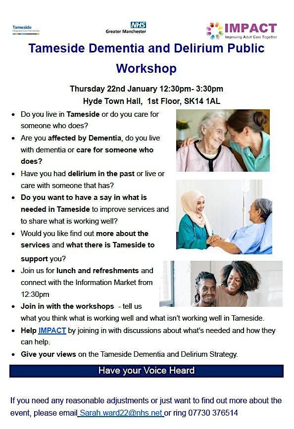 Join us for an in-person workshop all about dementia and delirium. It's a great chance to learn, share experiences, and pick up practical tips in a friendly setting. Perfect for anyone interested or involved in supporting those affected. Come along, have lunch, meet others, and get involved! This isn't about presentations. This is a chance to have your voice heard and help shape the future of Tameside's Dementia and Delirium's Services.