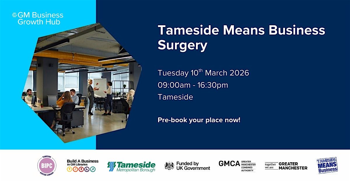 Delivered by GM Business Growth Hub, in partnership with Tameside Means Business and Build a Business in GM Libraries, our 45-minute drop‑in sessions give local businesses the chance to talk to Tameside Business Advisors 1-2-1.