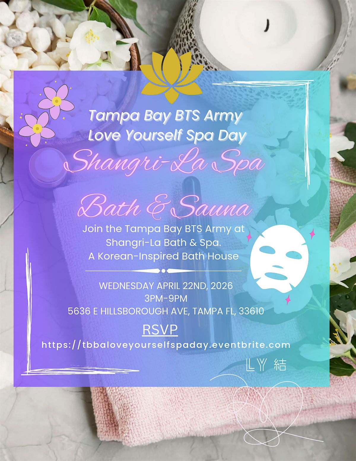 Welcome to the Tampa Bay BTS Army Spa Day! Join us at Shangri-La Bath & Sauna on April 22, 2026 at 3:00 PM for a day of relaxation and fun with fellow BTS fans.