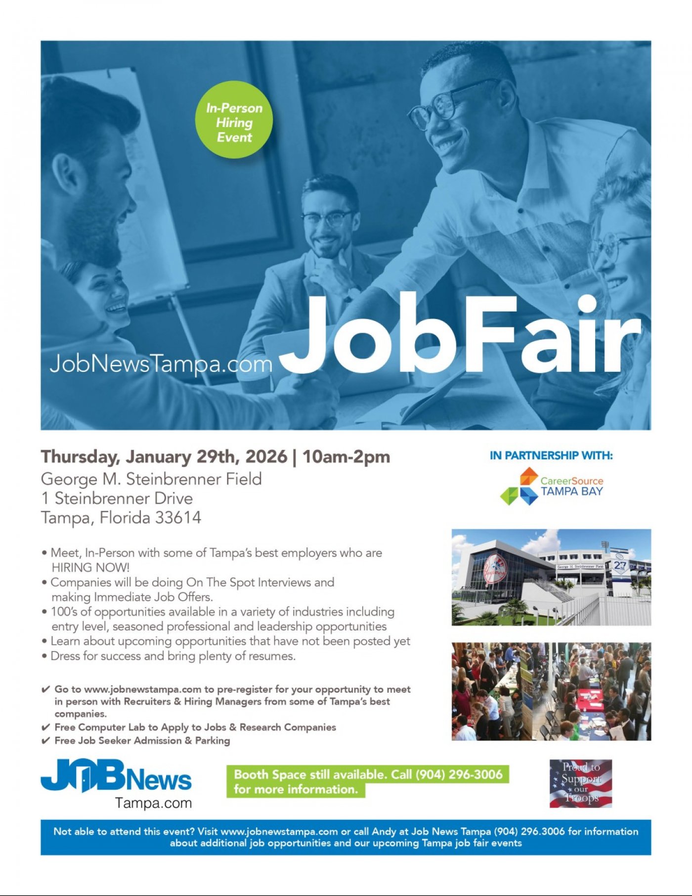 Job News Tampa, along with our SPONSOR - CoverageX, and in Partnership with CareerSource Tampa Bay will be hosting a Hiring Event from 10 am to 2 pm on Thursday January 29th, 2026 at George Steinbrenner Field located at One Steinbrenner Drive Tampa FL 33614