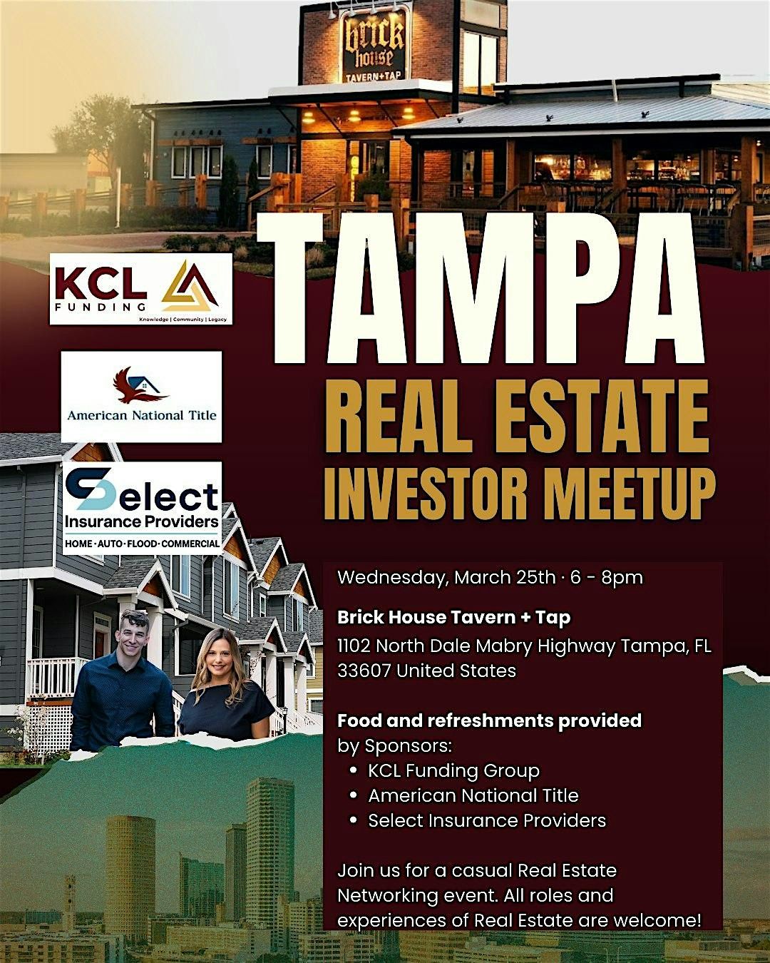 We will meet at Brick House Tavern and Tap (front patio) located at 1102 N Dale Mabry Hwy, Tampa, FL 33607. Light food and your first 2 drinks are on us! But please support Brick House by purchasing any additional food or drinks. They are gracious enough to hold the space for us.