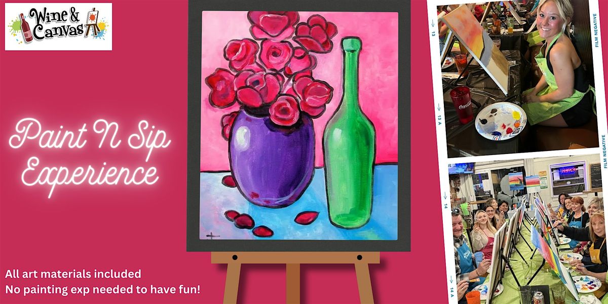 Join us for a fun and relaxing Tampa Sip and Paint event as we create “Bouquet of Roses,” a bold and vibrant still-life featuring rich pink blooms, a deep purple vase, and a classic wine bottle. It is perfect for painters of any level.
