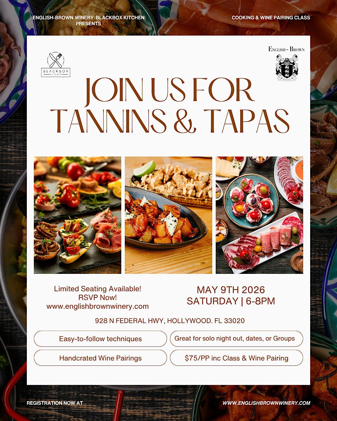 Join us at English-Brown Winery on Friday, May 9th at 6:30 PM for Tannins & Tapas, a curated wine and small bites experience in collaboration with Blackbox Kitchen.