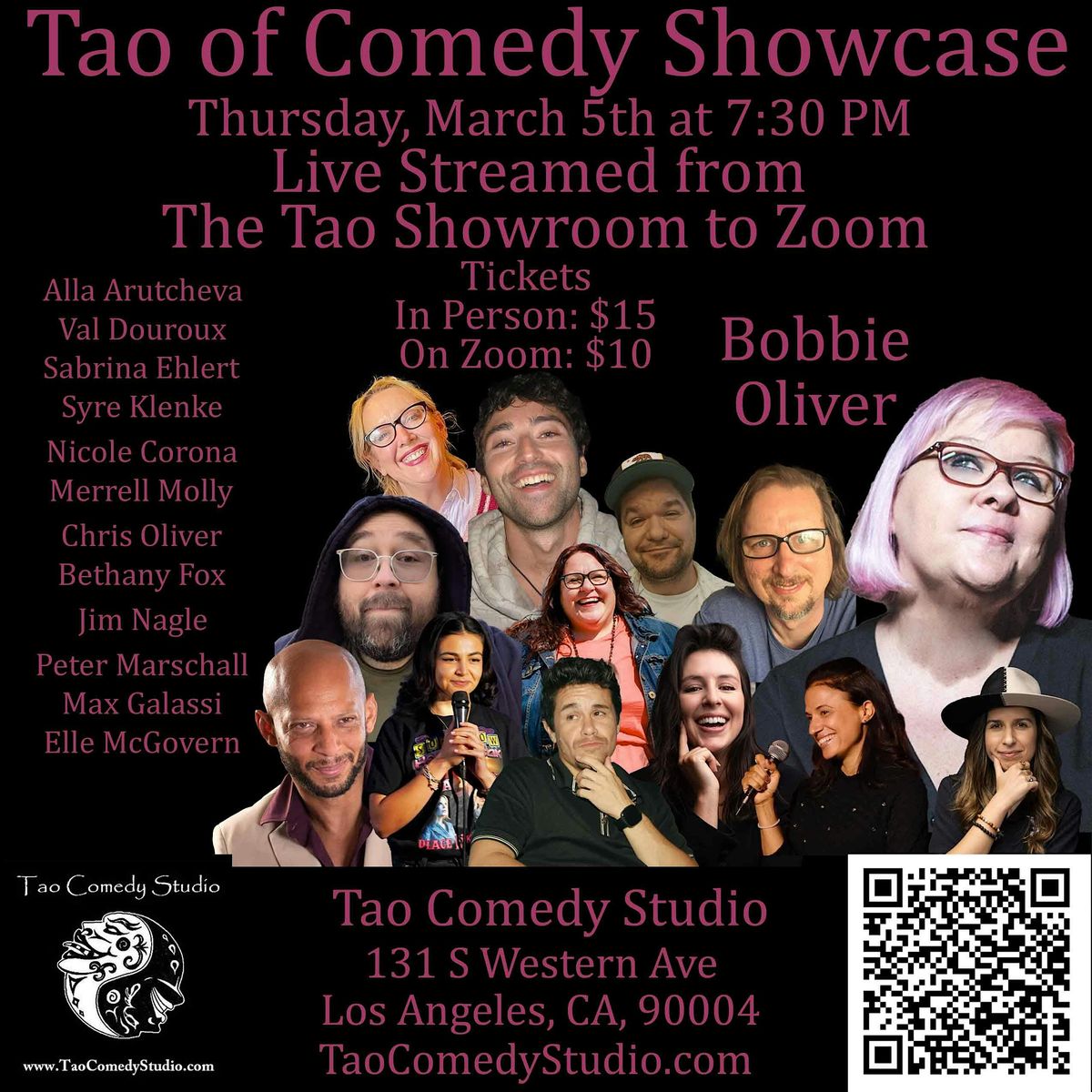 Live comedy show featuring the graduates of Bobbie Oliver's Tao of Comedy workshops at Tao Comedy Studio. In-person or on Zoom!