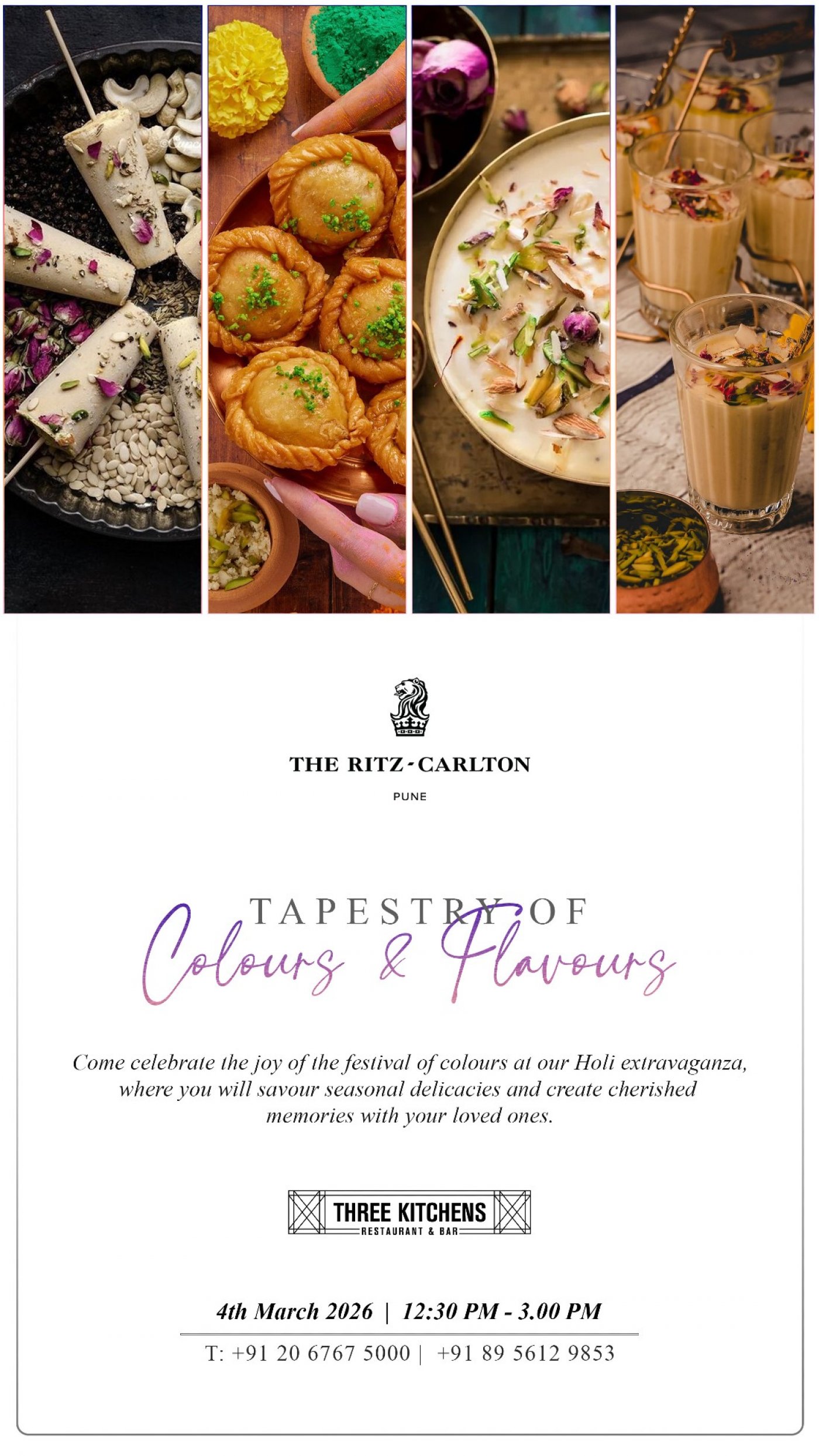 Celebrate the spirit of Holi with Tapestry of Colours & Flavours at Three Kitchens Restaurant & Bar at The Ritz-Carlton, Pune. This specially curated festive brunch brings together vibrant seasonal delicacies, traditional favourites, and indulgent sweet treats inspired by the colours of the season.