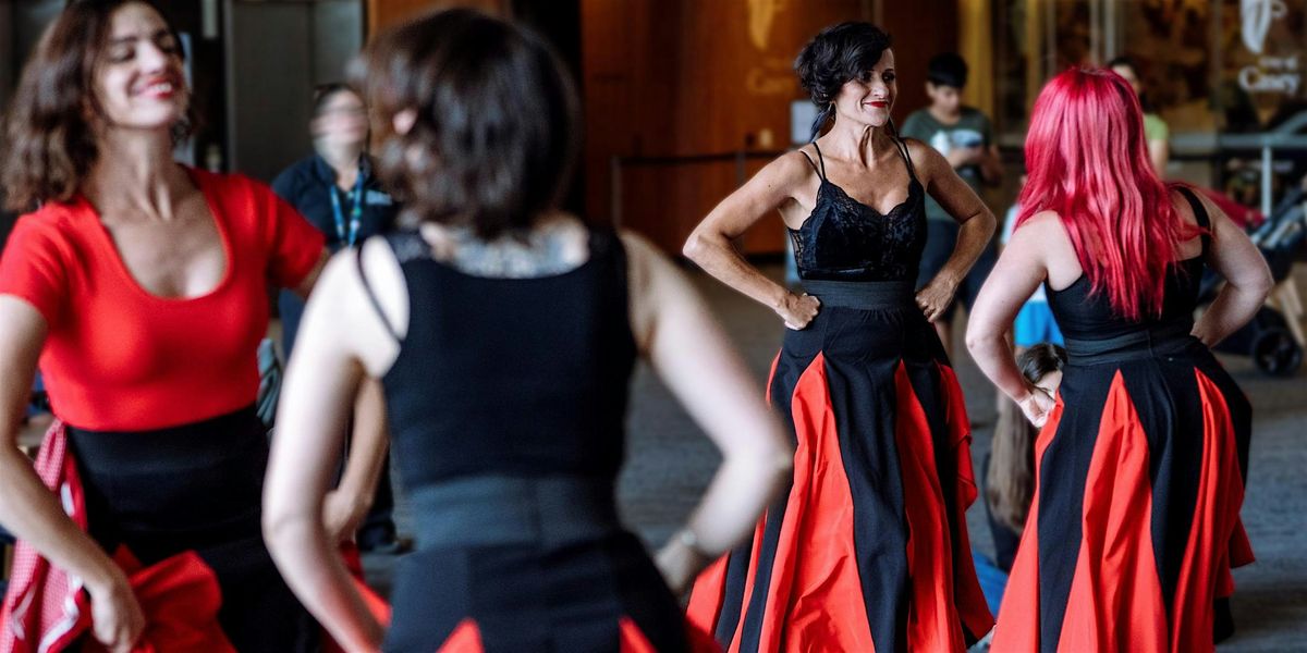 Image: Dancers from the Melbourne School of Tarantella perform in black and red costumes.