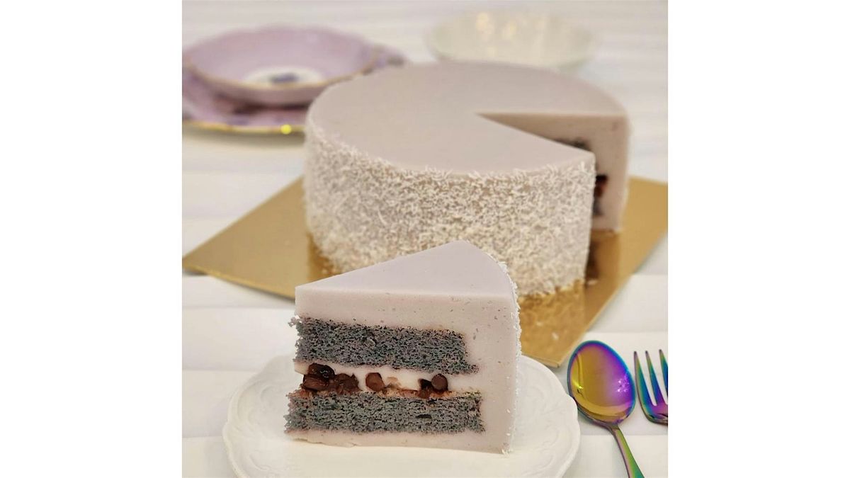 • Steps to assemble the taro layer, redbeans and chiffon cake