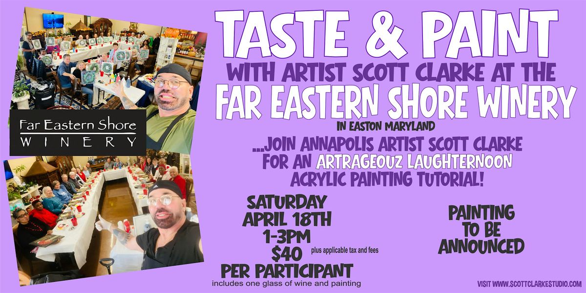 Join artist Scott Clarke at the Far Eastern Shore Winery in Easton Maryland for a 2 hour acrylic painting tutorial. Enjoy the delicious wines while Scott takes you on a creative journey with laughter and creativity!