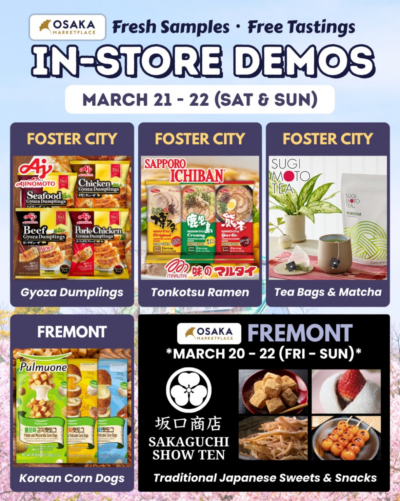 This weekend, Osaka Marketplace invites shoppers to explore a series of in-store tastings and cultural food experiences across its Bay Area locations. From Saturday, March 21 through Sunday, March 22, the Foster City store will host a Sanyo/Marutai Tonkotsu Ramen demo alongside additional samplings from Ajinomoto Gyoza and Sugimoto Tea. Meanwhile, the Fremont store will feature a lively lineup including a Pulmuone Korean Corn Dogs demo (March 21–22) and a special appearance by Sakaguchi Show Ten, running Friday, March 20 through Sunday, March 22, with an outdoor food stall offering traditional Japanese snacks and sweets, plus free sample tastings.