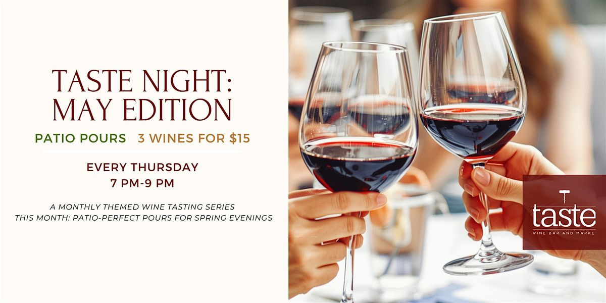 Join us every Thursday from 7:00–9:00 PM for Taste Night, our signature weekly wine tasting experience.