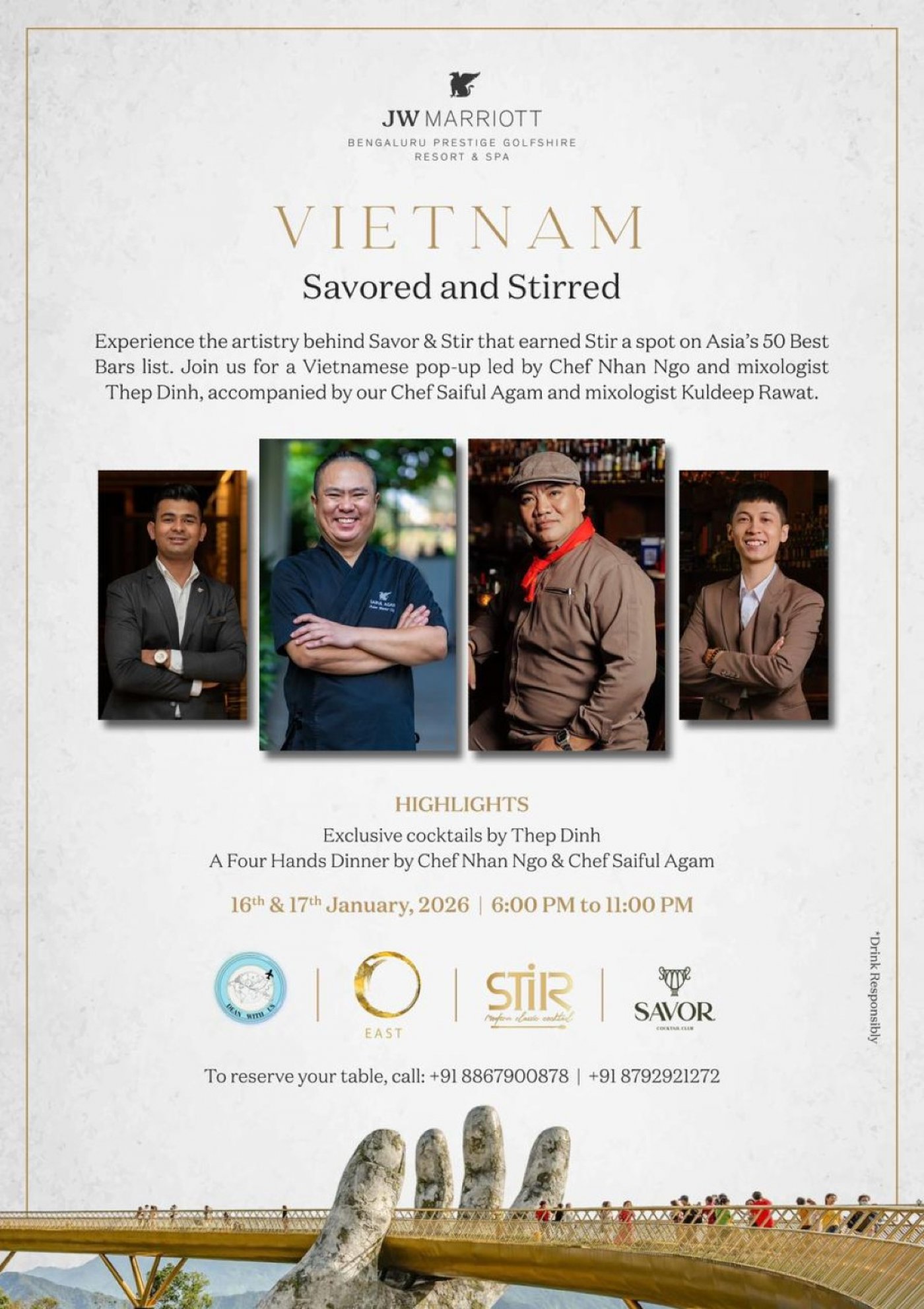 An exclusive two-day Vietnamese culinary and cocktail pop-up at JW Marriott Bengaluru Prestige Golfshire Resort & Spa on January 16–17, 2026, hosted at East – The Asian Living Room, featuring Stir – Modern Classic Cocktails, Vietnam. The experience brings together acclaimed mixologist Thep Dinh and celebrated chef Nhan Ngo, showcasing contemporary Vietnamese cocktails and cuisine through a modern, storytelling-led approach rooted in cultural heritage and innovation.
