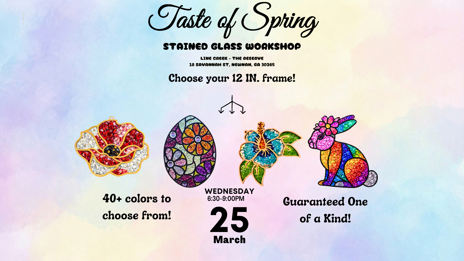 Step into a world of color and creativity at the Taste of Spring: Stained Glass Workshop hosted by Pixi's Palette Playground. Join us on March 25, 2026, at 6:30 PM at Line Creek - The Reserve in Newnan for a one-of-a-kind artistic experience.