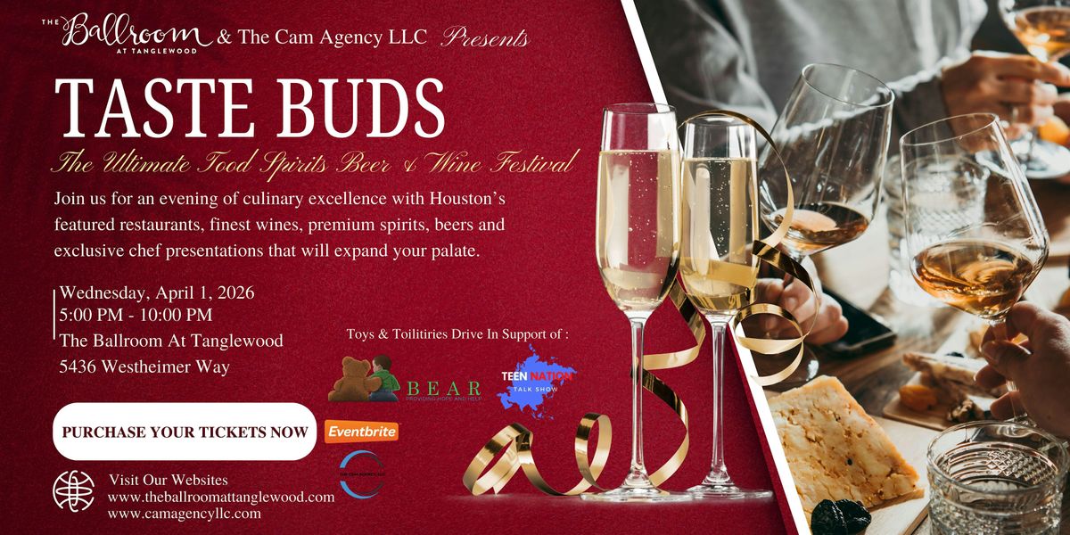Houston, TX — January 8, 2026 — The Cam Agency, LLC, in partnership with The Session Talk Show and The Ballroom at Tanglewood, announces Tastebuds: Food, Beer & Wine Festival, a premier culinary and culture experience taking place Wednesday, April 1, 2026.