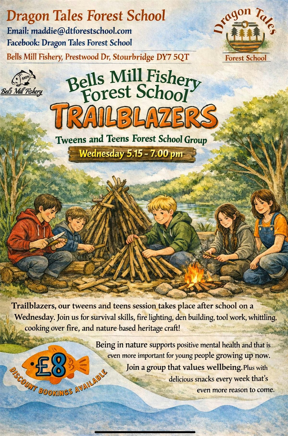 Join us for a taster session for Trailblazers, our tweens and teens session takes place after school on a Wednesday, for ages 10 to 16. If you have a tween or teen that is interested in; survival skills, fire lighting, den building, tool work, whittling, cooking over fire, nature- based and heritage craft- then this is the place to be.