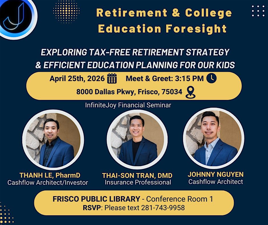 Join us in person for a fun and informative workshop where you'll discover smart strategies to secure a tax-free retirement and plan ahead for college/higher education for your children. Whether you're just starting out or looking to sharpen your financial game, this session is packed with easy-to-understand tips and insights. Don't miss out on learning how to take control of your financial future with confidence!
