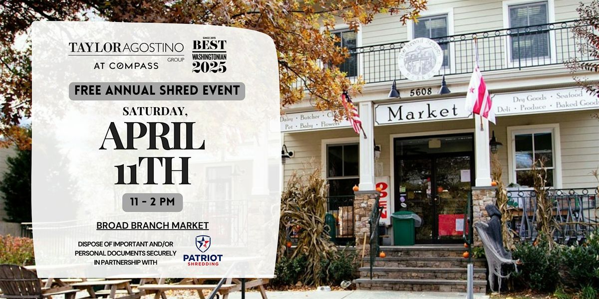 Please join us for our FREE annual Taylor Agostino Shred Event at Broad Branch Market! Use this opportunity to safely dispose of important documents like: