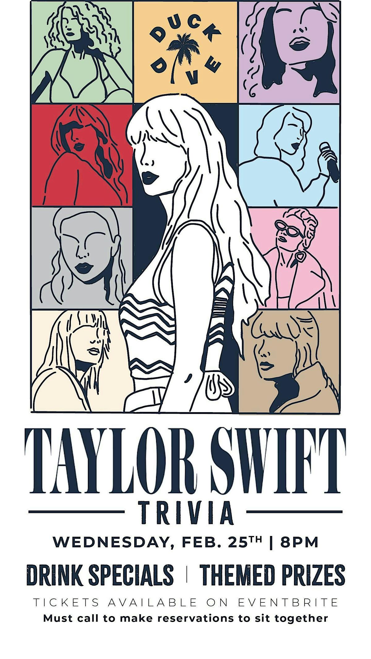 Get ready for a night of fun and Swiftie vibes at The Duck Dive! Join us in person to test your knowledge of all things Taylor Swift. Whether you know every lyric or just love the hits, this trivia night is for you. Bring your friends, enjoy some laughs, and see who really knows Taylor best. Don’t miss out on the ultimate Taylor Swift trivia experience!