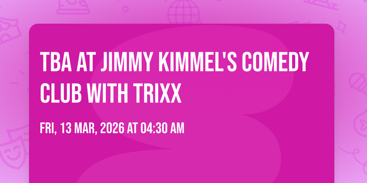 📍 Location: 36.1182, -115.171🎉 Welcome to TBA at Jimmy Kimmel's Comedy Club with Trixx, where dreams come alive and possibilities are endless! 🏛️ Join us at Jimmy Kimmel's Comedy Club at the Linq Promenade in the heart of Las Vegas, NV for an event that defies expectations. 📅 On May 31st, 2026 at 04:30 AM, be part of something truly extraordinary as we bring together innovation, entertainment, and pure magic. ✨ Every aspect has been carefully designed to ensure an unforgettable experience for all our guests. Whether you're seeking adventure, inspiration, or simply a break from the ordinary, this event promises to deliver beyond your wildest dreams. 🎊 Prepare for a journey into the extraordinary!