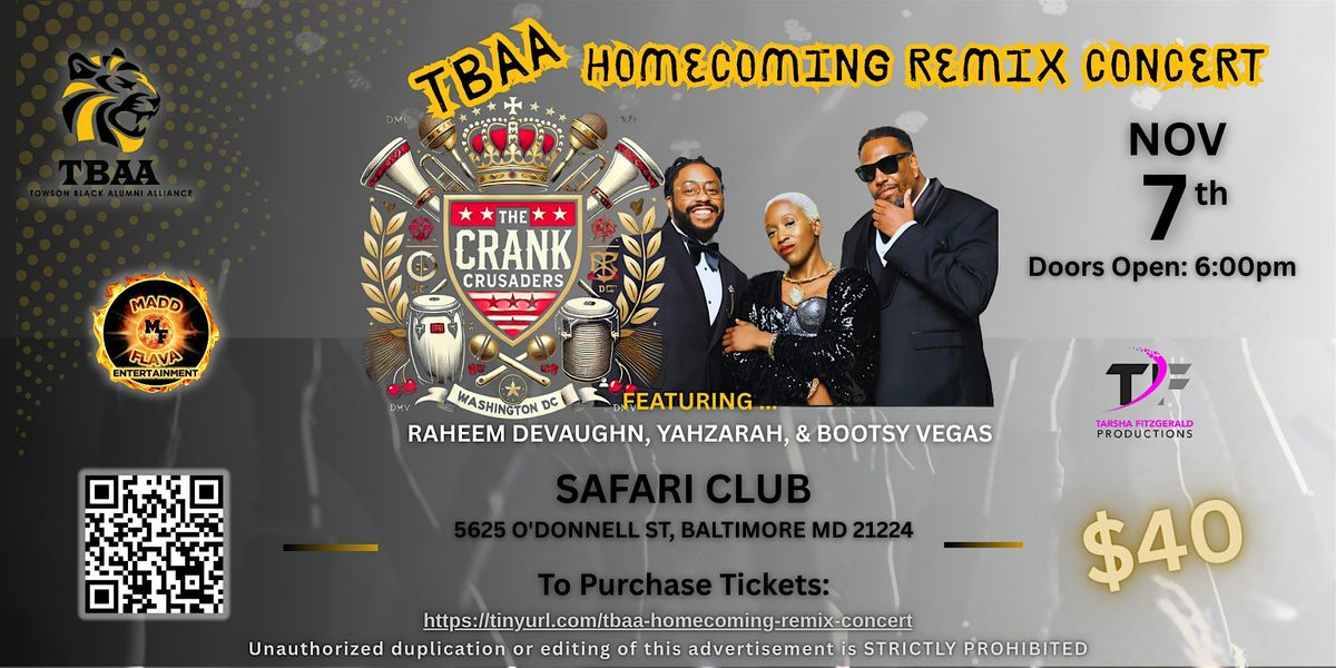 Come out and party with the Towson Black Alumni Alliance. This Homecoming Remix Concert will feature performances by The Crank Crusaders with Raheem DeVaughn, Yahzarah, and Bootsy Vegas, along with music by DJ Rod Madd Flava.