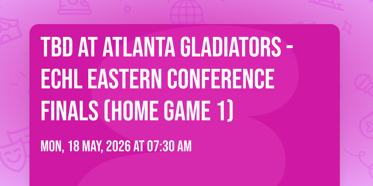 📍 Location: 33.9896, -84.0942🌟 Step into a world of wonder at TBD at Atlanta Gladiators - ECHL Eastern Conference Finals (Home Game 1), where extraordinary moments await! 🏛️ Located at Gas South Arena in dynamic Duluth, GA, this event will become the talk of the town. 📅 Join us on May 18th, 2026 at 07:30 AM for a celebration that defies the ordinary. ✨ This curated experience brings together the best of entertainment, culture, and community spirit. Every detail has been thoughtfully planned to ensure an unforgettable experience for all our guests. 🎯 Take advantage of this opportunity to be part of something special. 🎊 Early registration is recommended as space is limited!