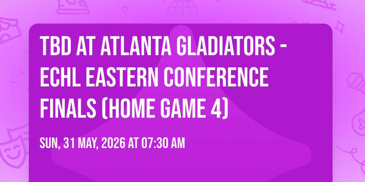 📍 Location: 33.9896, -84.0942🎉 Welcome to TBD at Atlanta Gladiators - ECHL Eastern Conference Finals (Home Game 4), where dreams come alive and possibilities are endless! 🏛️ Join us at Gas South Arena in the heart of Duluth, GA for an event that defies expectations. 📅 On May 31st, 2026 at 07:30 AM, be part of something truly extraordinary as we bring together innovation, entertainment, and pure magic. ✨ Every aspect has been carefully designed to ensure an unforgettable experience for all our guests. Whether you're seeking adventure, inspiration, or simply a break from the ordinary, this event promises to deliver beyond your wildest dreams. 🎊 Prepare for a journey into the extraordinary!