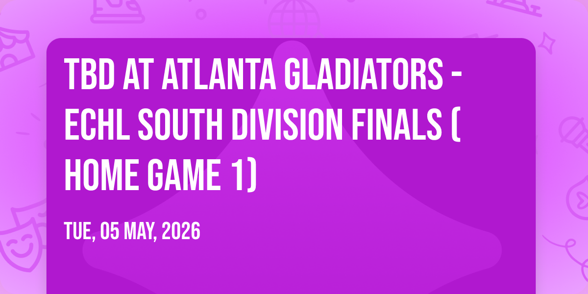 📍 Location: 33.9896, -84.0942✨ Embark on an extraordinary journey at TBD at Atlanta Gladiators - ECHL South Division Finals (Home Game 1), where every moment promises to be unforgettable! 🌟 Imagine of transforming Gas South Arena in the heart of Duluth, GA into a realm of endless possibilities. 📅 Join us on May 5th, 2026 at 07:30 AM for an experience that will challenge your imagination and exceed your expectations. 🎯 This carefully curated event combines the finest elements of entertainment, innovation, and community spirit. Whether you're an adventure seeker, culture enthusiast, or someone looking for unique experiences, this event offers something special for everyone. 🎊 Don't miss this chance to be part of something extraordinary!