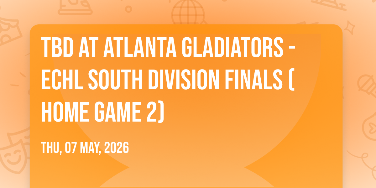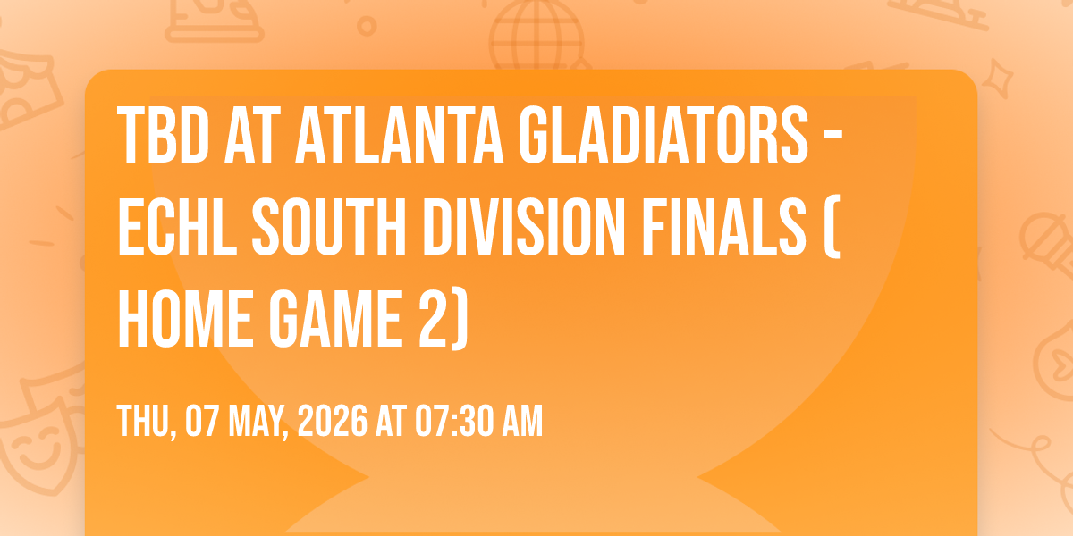 📍 Location: 33.9896, -84.0942🎉 Welcome to TBD at Atlanta Gladiators - ECHL South Division Finals (Home Game 2), where the impossible becomes possible and dreams take flight! 🏛️ Join us at Gas South Arena in the heart of Duluth, GA for an event that will redefine your expectations. 📅 On May 7th, 2026 at 07:30 AM, witness the transformation of space and time into something truly magical. ✨ It's a curated experience combining the best of innovation, entertainment, and community spirit, creating moments that will be remembered for years to come. Whether you're a first-time visitor or a seasoned enthusiast, prepare to be amazed. 🎊 Book now to ensure your place in this unforgettable experience!