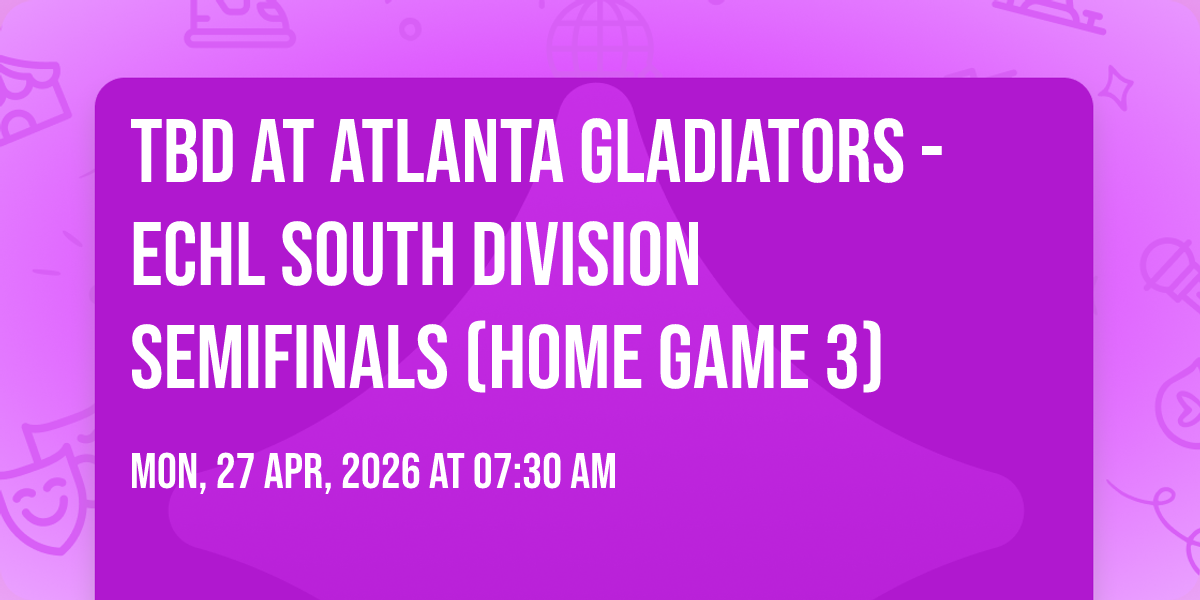 📍 Location: 33.9896, -84.0942🌟 Be part of history at TBD at Atlanta Gladiators - ECHL South Division Semifinals (Home Game 3), an extraordinary gathering that will captivate your imagination! 🏛️ The prestigious Gas South Arena in Duluth, GA sets the stage for an unforgettable experience on April 27th, 2026 at 07:30 AM. ✨ They are bringing together the finest elements of entertainment and innovation to create moments that will take your breath away. From the moment you arrive, you'll be immersed in an atmosphere of wonder and excitement. 🎯 This carefully planned event ensures every guest experiences something truly special. 🎊 Early booking is recommended for this must-attend event of the season!
